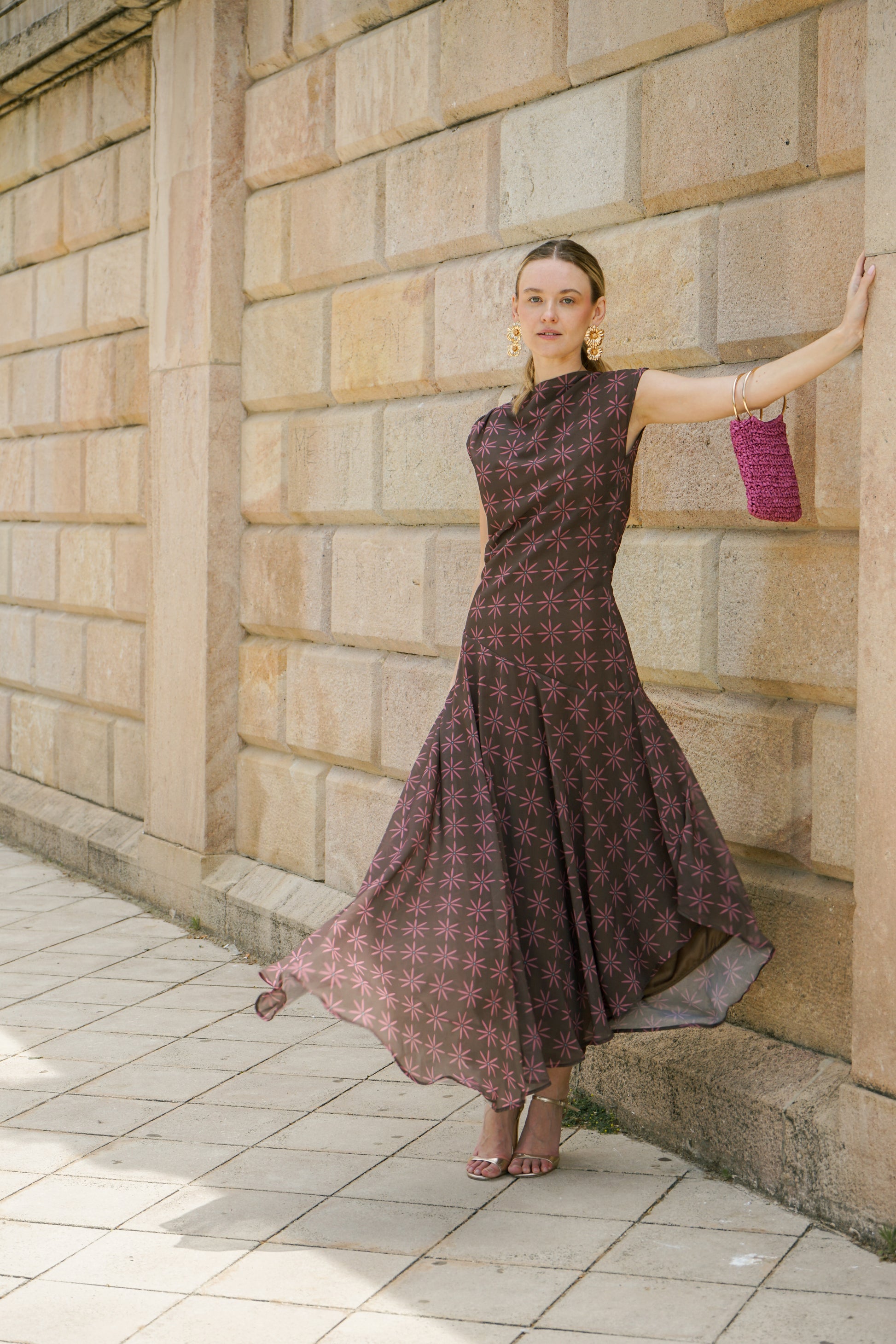 El estampado floral en tonos rosa sobre la base marrón chocolate aporta un contraste sofisticado y llamativo. Además, lleva una cremallera invisible en el lateral para un ajuste perfecto. Confeccionado en gasa ligera con forro interior, es ideal para ocasiones especiales que requieren una combinación de estilo y confort.