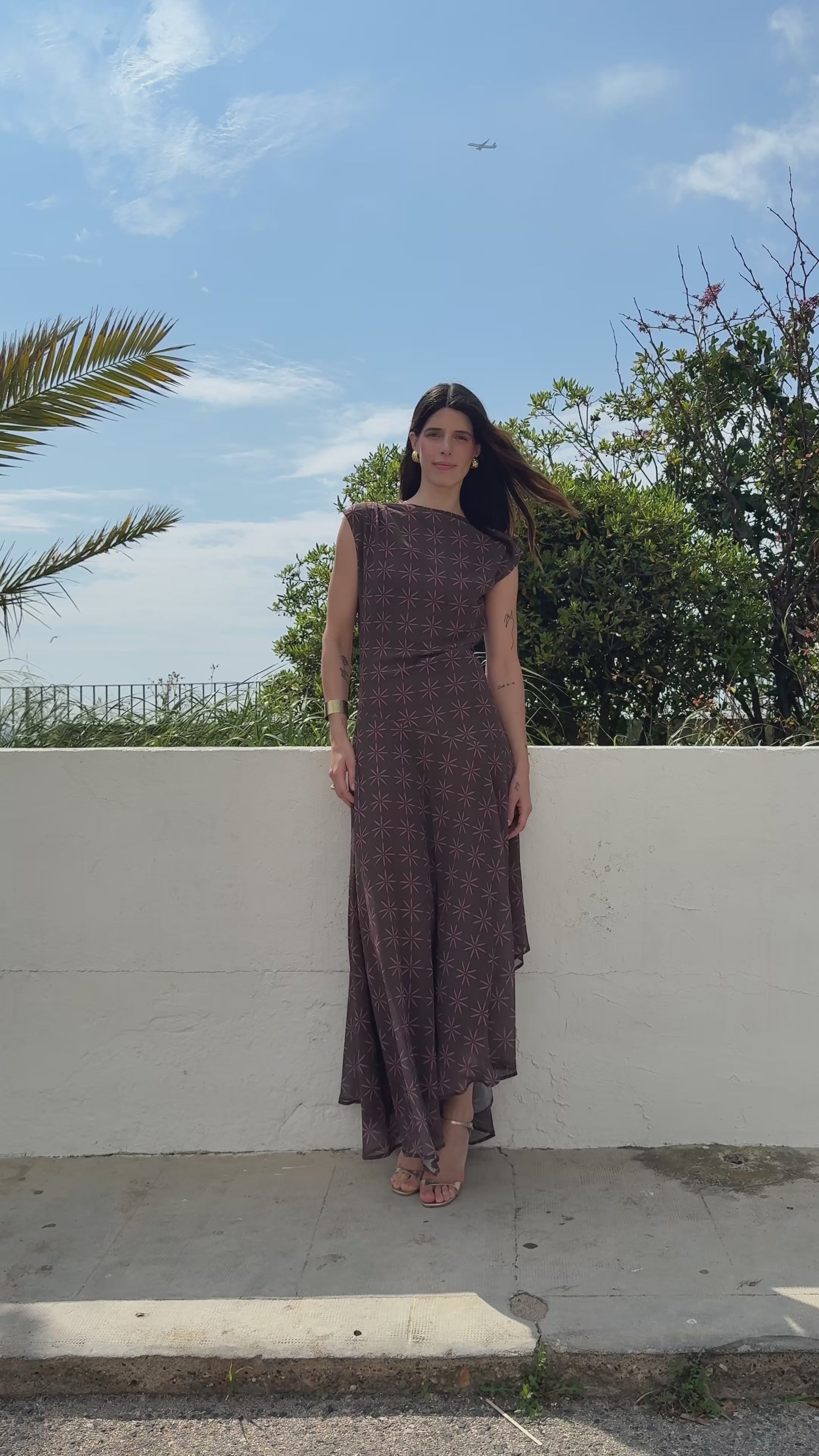 El vestido largo de manga corta con estampado floral en rosa y marrón chocolate presenta un diseño con una sutil asimetría que aporta un toque moderno y elegante. Su corte ajustado al cuerpo realza la silueta, mientras que la falda asimétrica en un lateral crea movimiento y dinamismo.