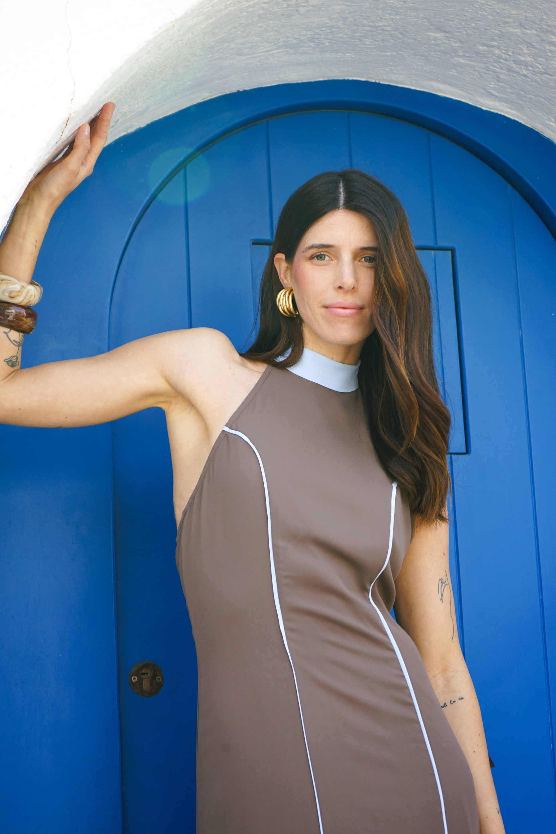 Su cuello halter realza los hombros, mientras que los ribetes en azul recorren el vestido desde el pecho hasta el bajo, creando un efecto visual que estiliza la silueta. La lazada en el mismo tono aporta un contraste sutil y elegante. Incluye una cremallera invisible en la espalda para un ajuste cómodo y discreto.