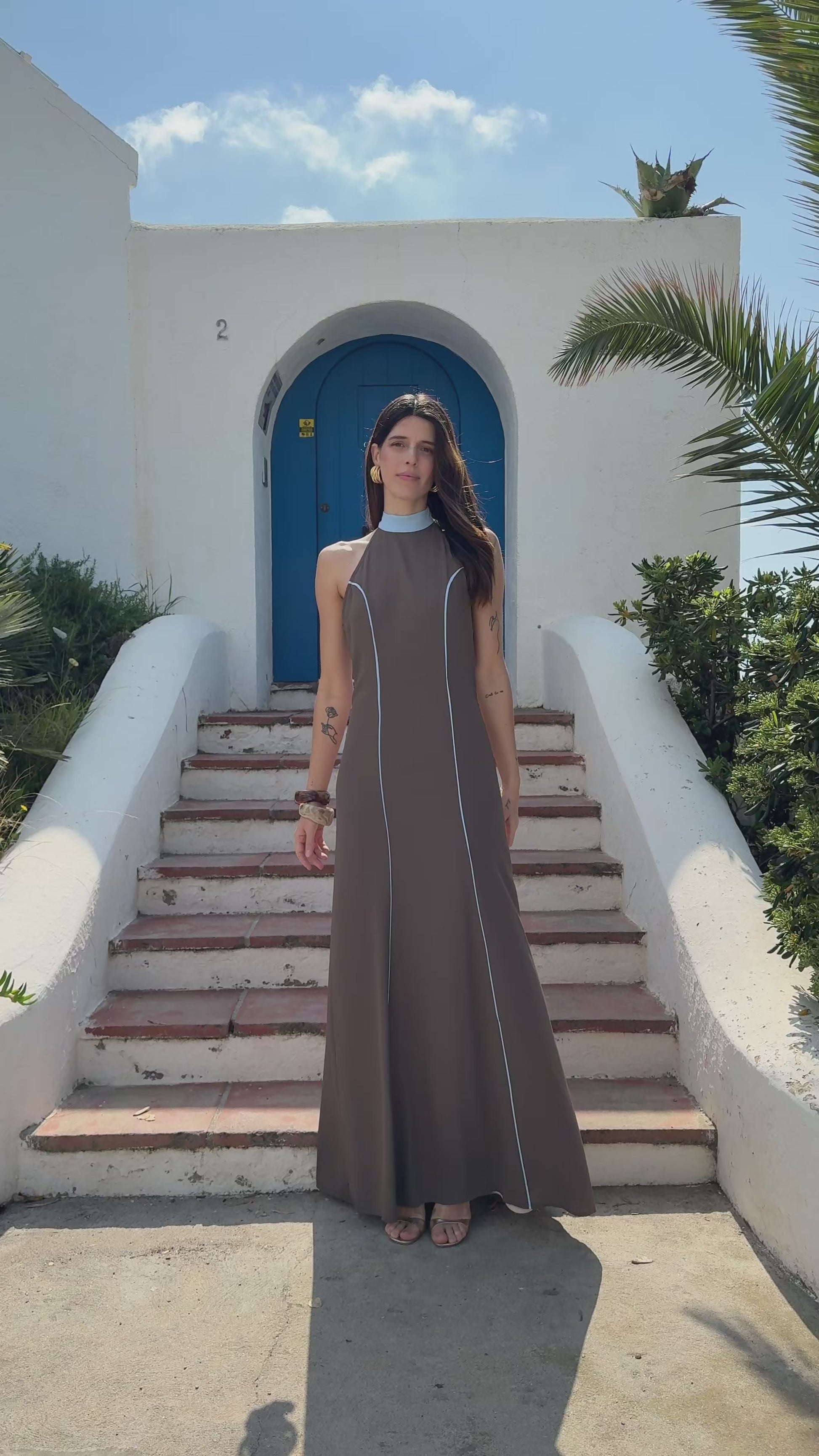 El vestido largo de gasa con cuello halter, en tonos marrón chocolate y azul bebé, está confeccionado en tejido ligero con forro interior para mayor comodidad.