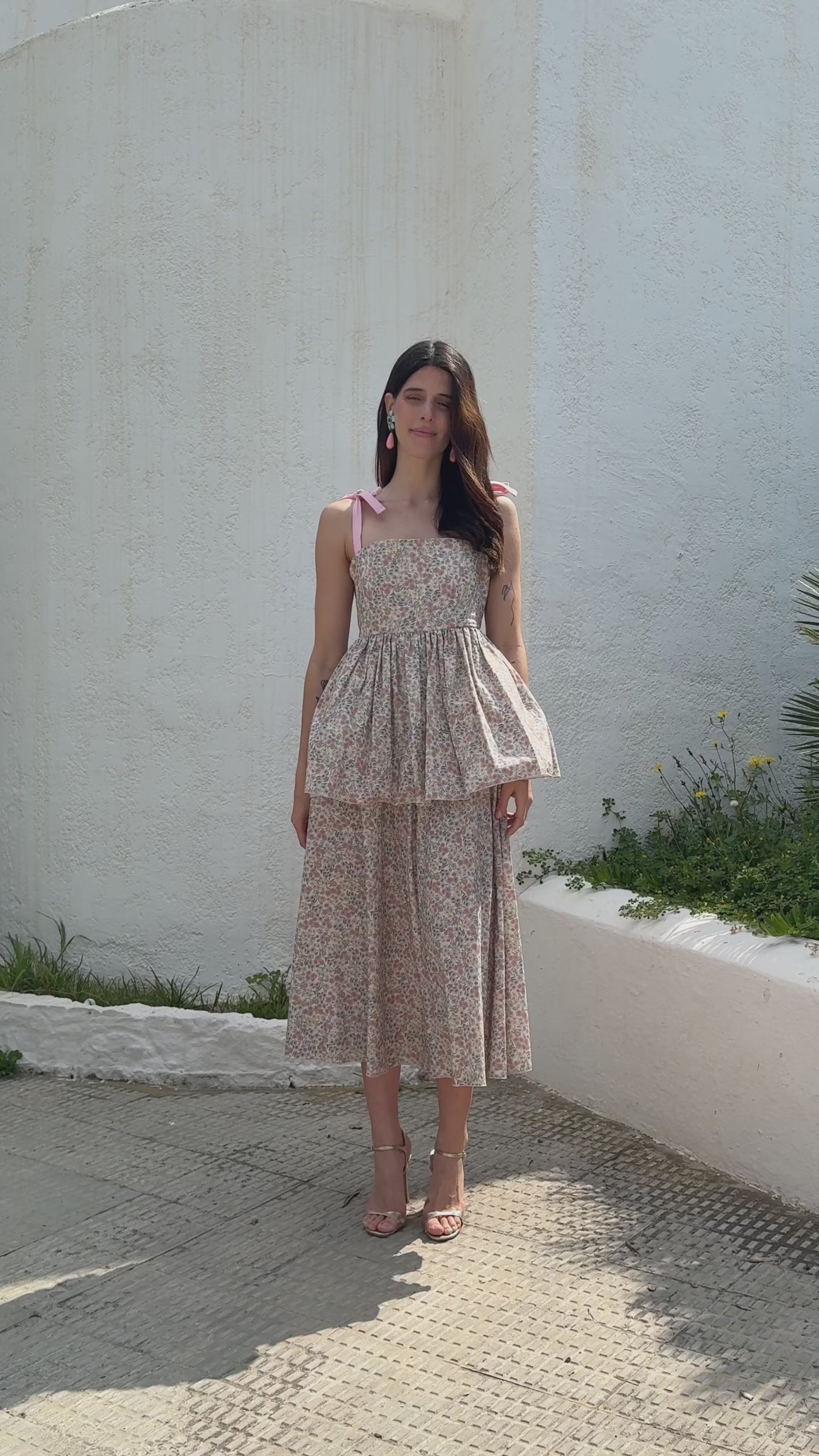 Los tirantes, con lazo sutil en rosa, son ajustables para una sujeción personalizada, adaptándose a cada persona. El volante en la parte superior, justo debajo del pecho, crea un efecto de dos capas, añadiendo volumen y fluidez al conjunto.
